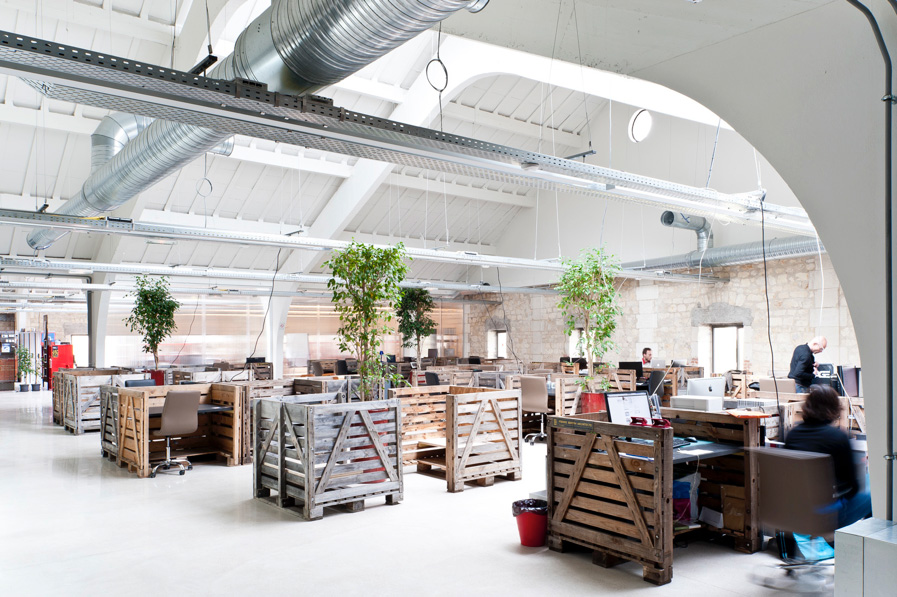 LaLa architectes a mis en scène des cubes de bois recyclés servant au transport de marchandises. Ils deviennent la base d’assemblages en tête-bêche, vis-à-vis, totems… Chaque combinaison assure une fonction dans cet espace ouvert : travailler tout en pouvant échanger, avoir une discussion plus privée, ou téléphoner sans importuner ses voisins !